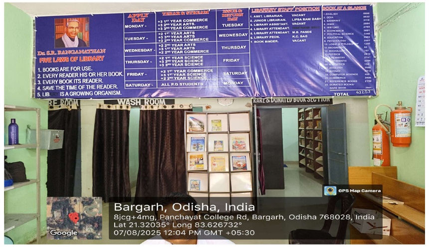 The Library of Panchayat College, Bargarh is one of the oldest and most resourceful libraries in the region. It houses a large collection of textbooks, reference books, journals, and other academic materials across various disciplines. The library caters to the academic and informational needs of students, faculty, and staff by providing reading, lending, reference, information, and documentation facilities.